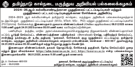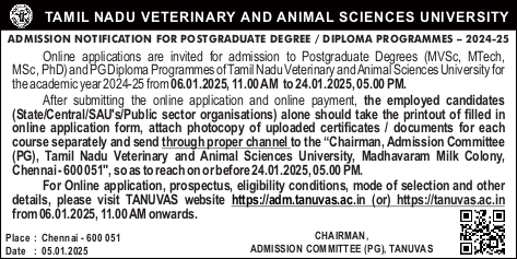 After submitting the online application and online payment, the employed candidates (State/Central/SAU’S/Public sector organizations) alone should take the printout of filled in online application form, attach photocopy of uploaded certificates / documents for each course separately and send through proper channel to the “Chairman, Admission Committee (PG), Tamil Nadu Veterinary and Animal Sciences University, Madhavaram Milk Colony, Chennai - 600 051”, to reach", on or before